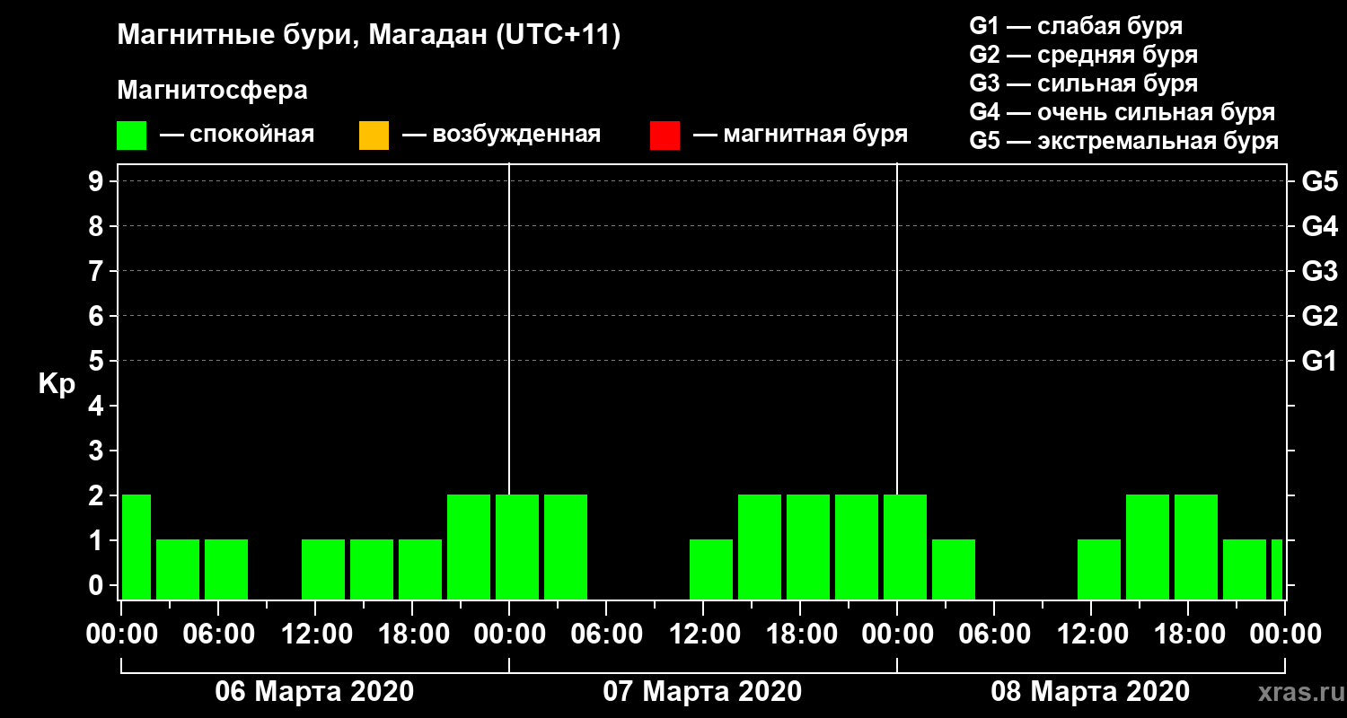 Изменения геомагнитного индекса Kp с 6 по 8 марта 2020 года для средних широт