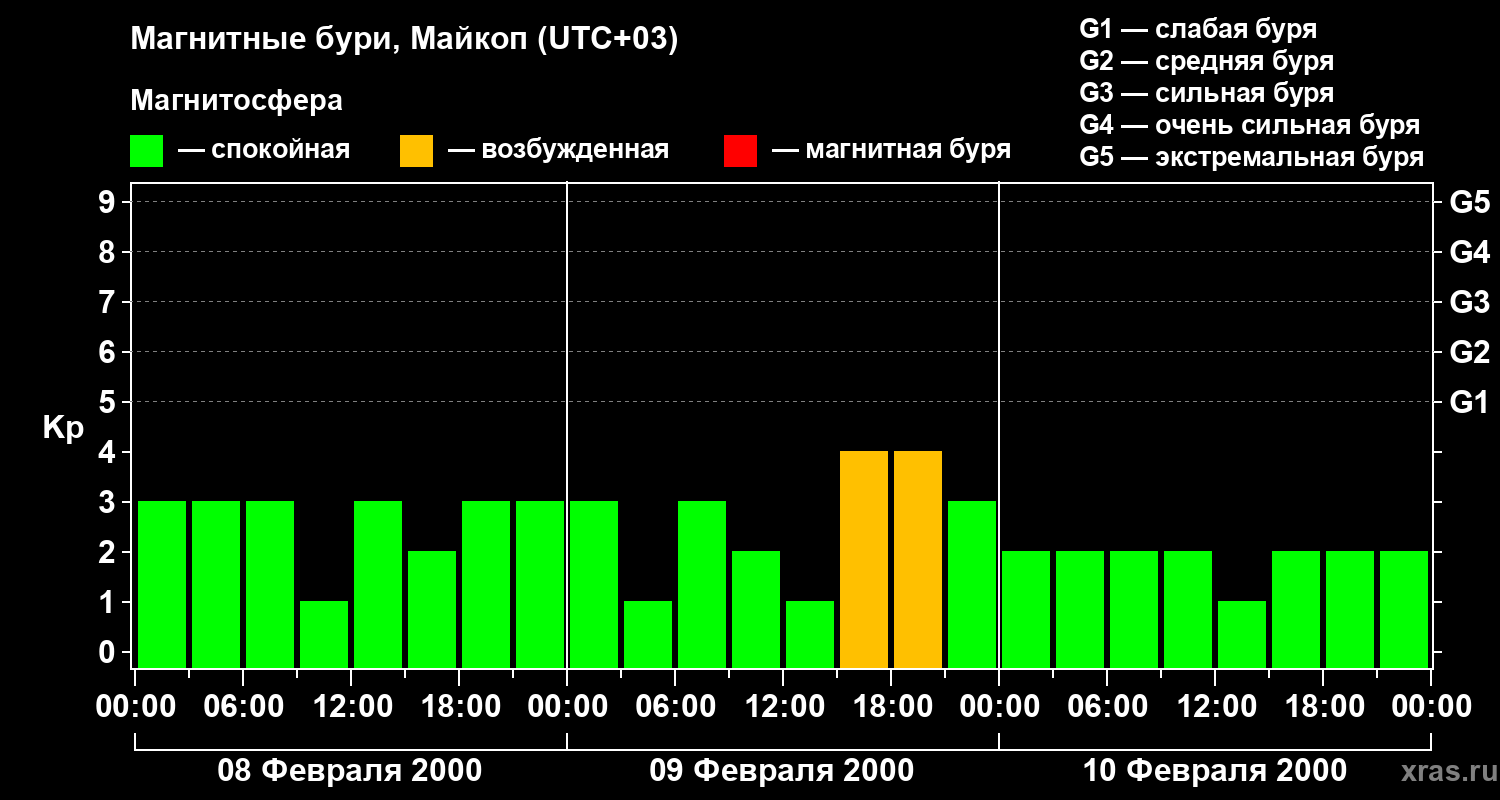 Изменения геомагнитного индекса Kp с 8 по 10 февраля 2000 года для средних широт