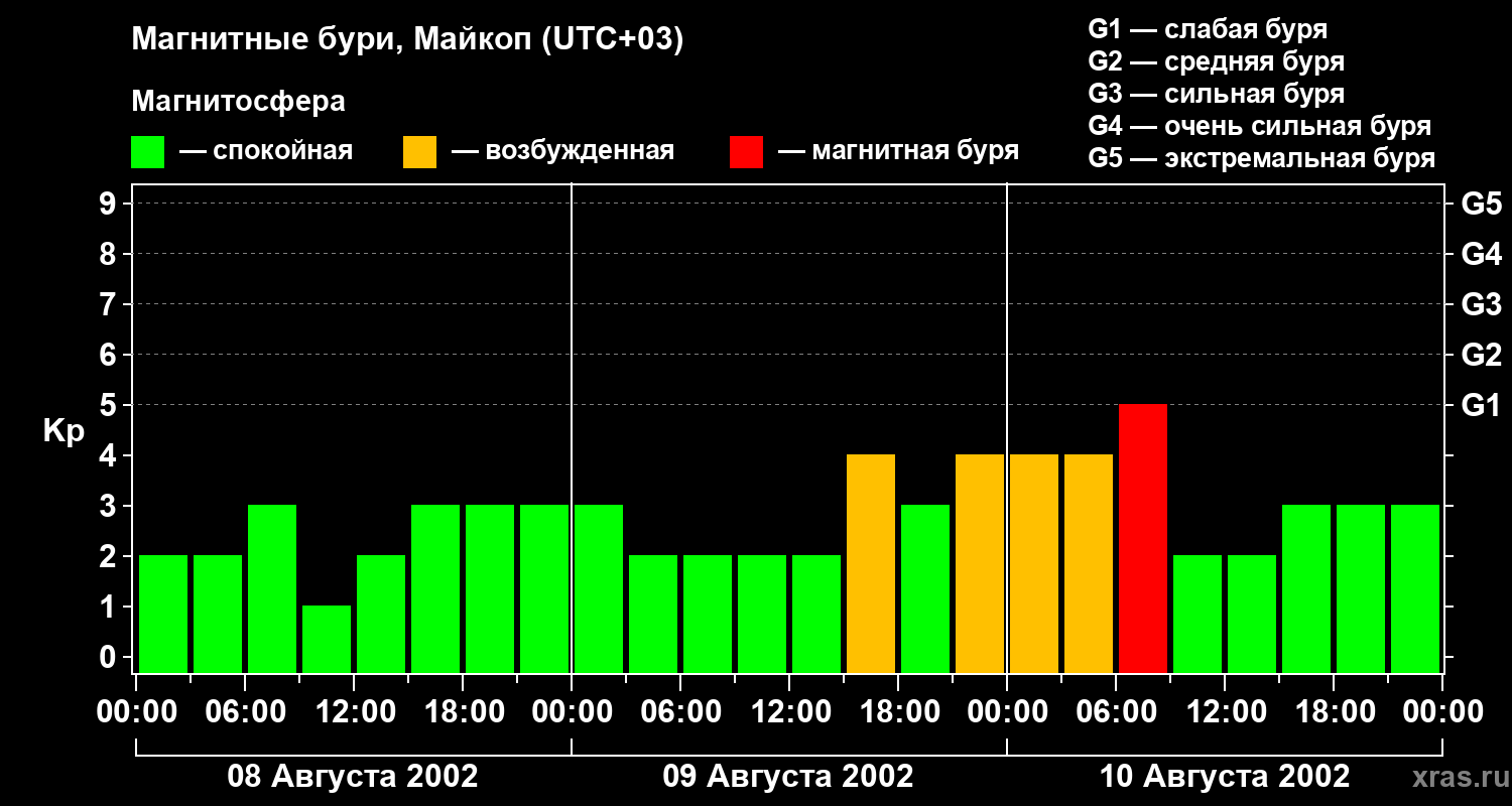 Изменения геомагнитного индекса Kp с 8 по 10 августа 2002 года для средних широт