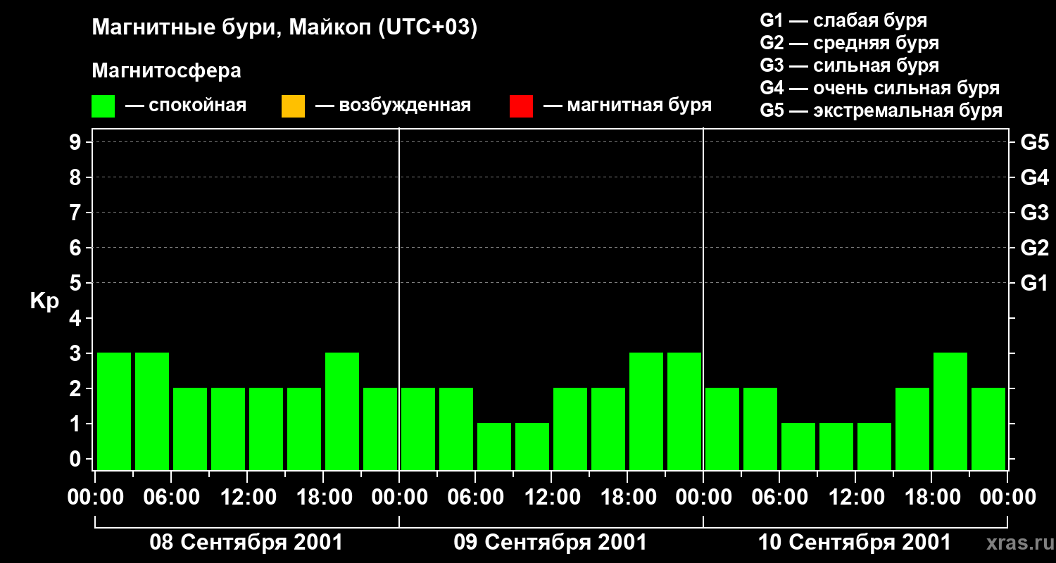 Изменения геомагнитного индекса Kp с 8 по 10 сентября 2001 года для средних широт