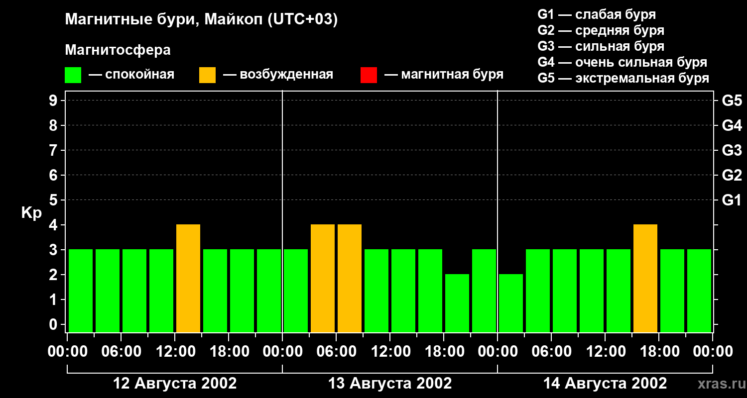Изменения геомагнитного индекса Kp с 12 по 14 августа 2002 года для средних широт