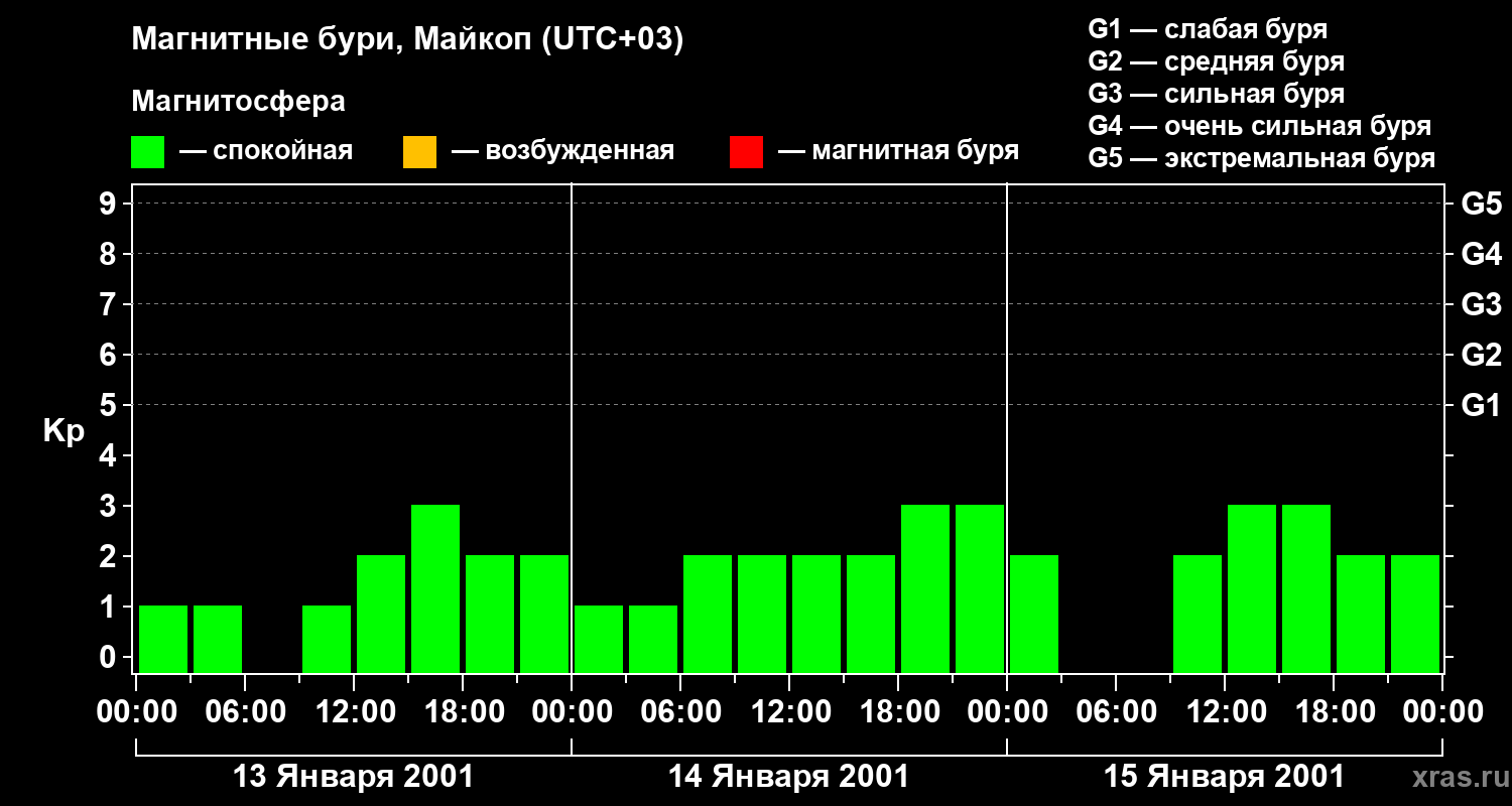 Изменения геомагнитного индекса Kp с 13 по 15 января 2001 года для средних широт