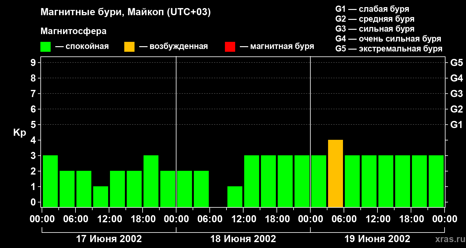 Изменения геомагнитного индекса Kp с 17 по 19 июня 2002 года для средних широт