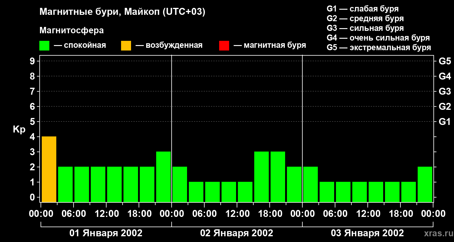 Изменения геомагнитного индекса Kp с 1 по 3 января 2002 года для средних широт