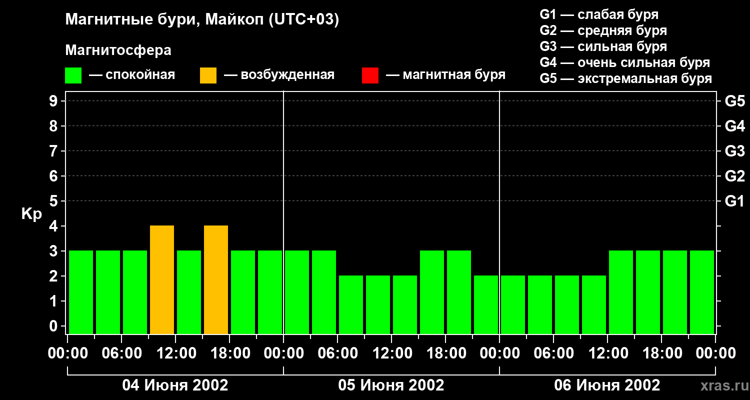 Изменения геомагнитного индекса Kp с 4 по 6 июня 2002 года для средних широт