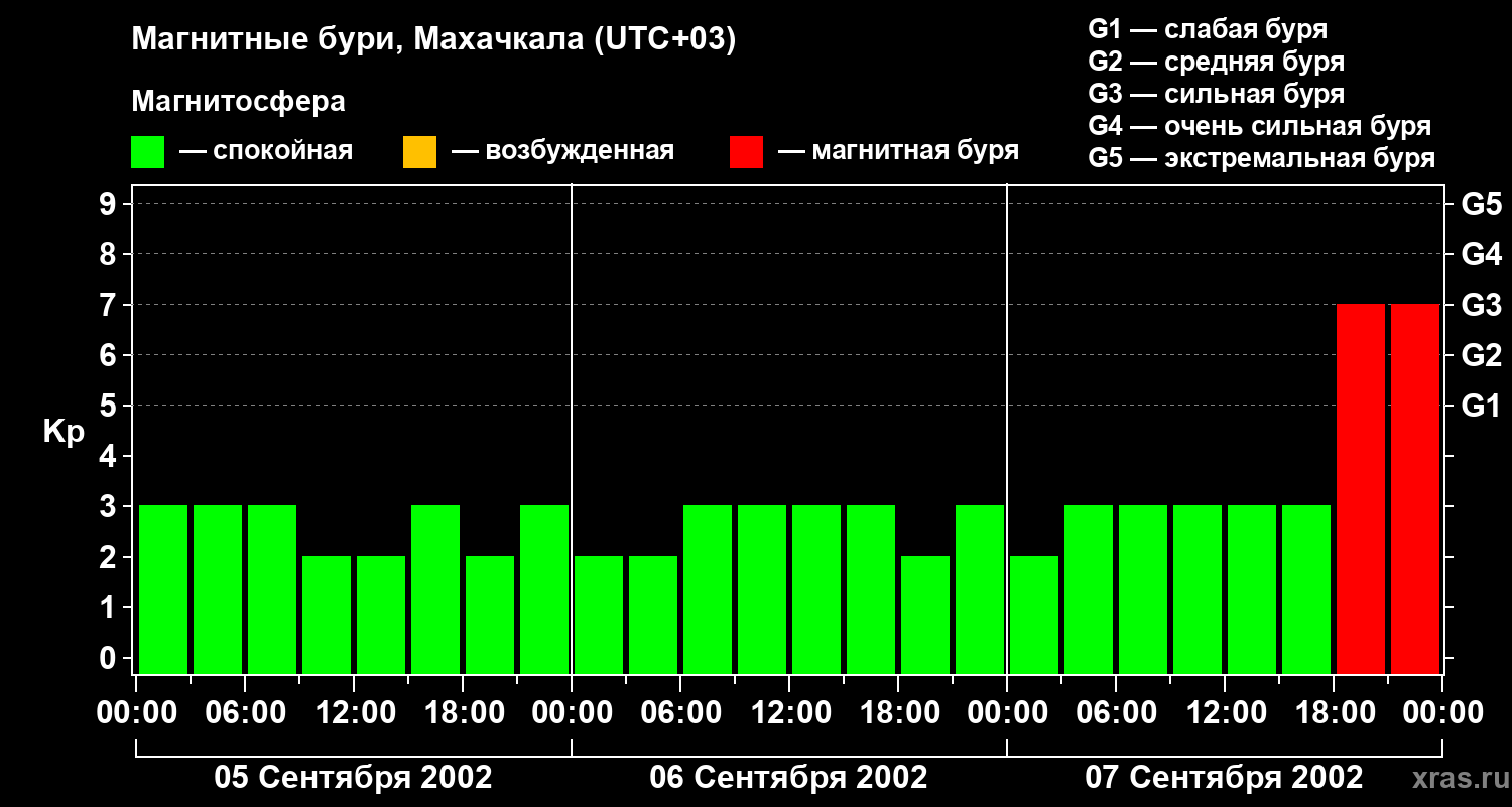 Изменения геомагнитного индекса Kp с 5 по 7 сентября 2002 года для средних широт