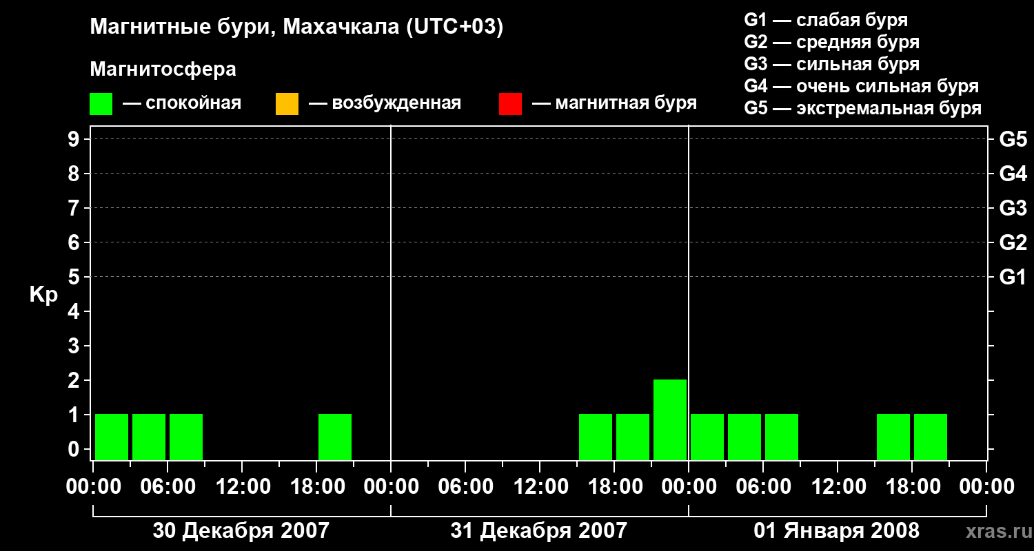 Изменения геомагнитного индекса Kp с 30 декабря 2007 года по 1 января 2008 года для средних широт