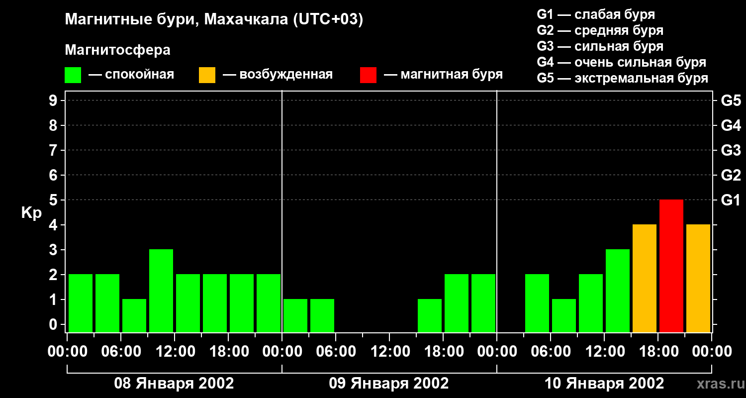Изменения геомагнитного индекса Kp с 8 по 10 января 2002 года для средних широт