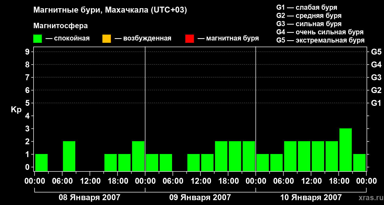 Изменения геомагнитного индекса Kp с 8 по 10 января 2007 года для средних широт
