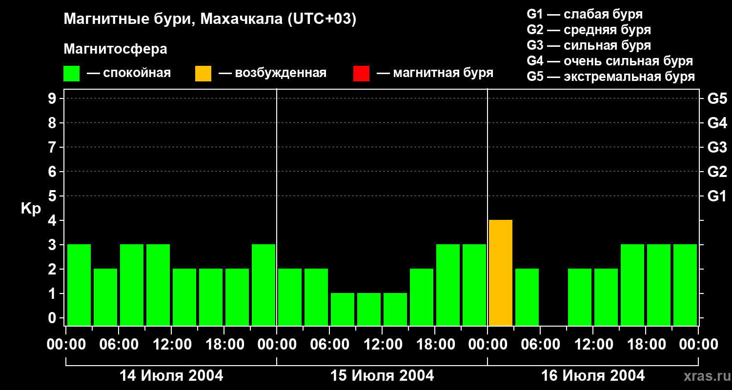 Изменения геомагнитного индекса Kp с 14 по 16 июля 2004 года для средних широт