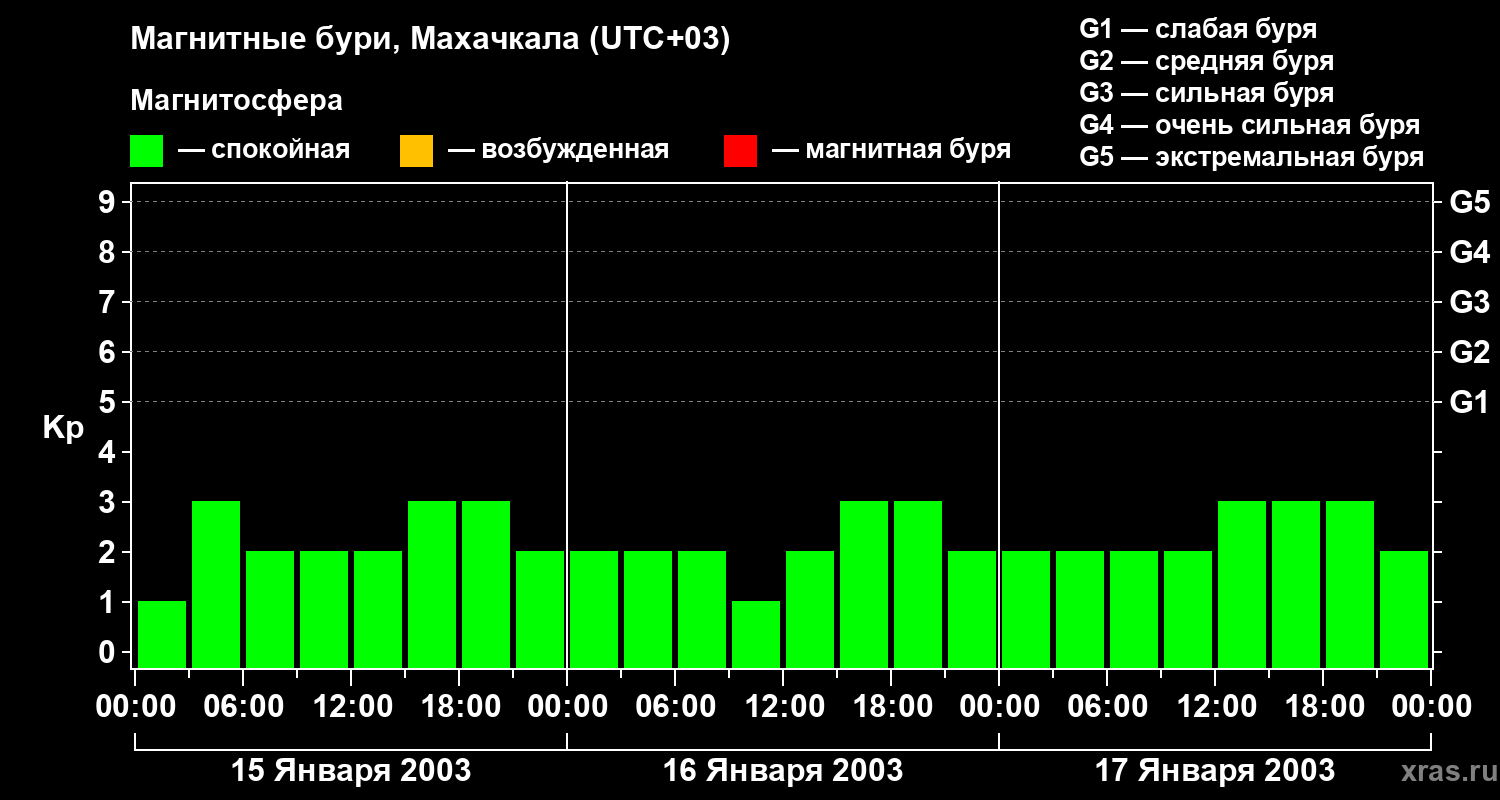 Изменения геомагнитного индекса Kp с 15 по 17 января 2003 года для средних широт