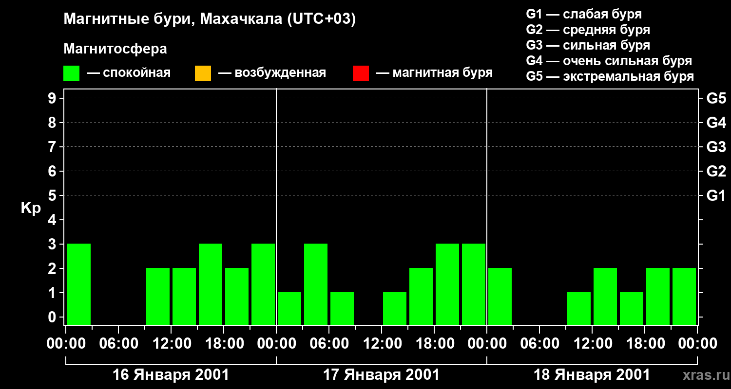 Изменения геомагнитного индекса Kp с 16 по 18 января 2001 года для средних широт