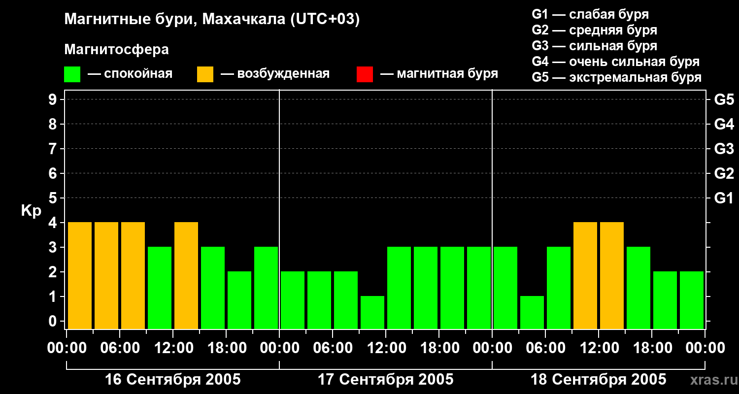 Изменения геомагнитного индекса Kp с 16 по 18 сентября 2005 года для средних широт