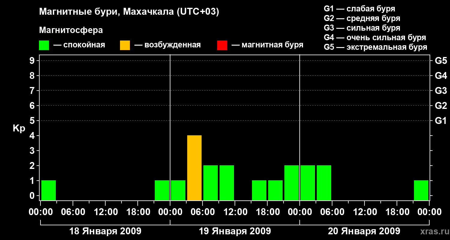 Изменения геомагнитного индекса Kp с 18 по 20 января 2009 года для средних широт