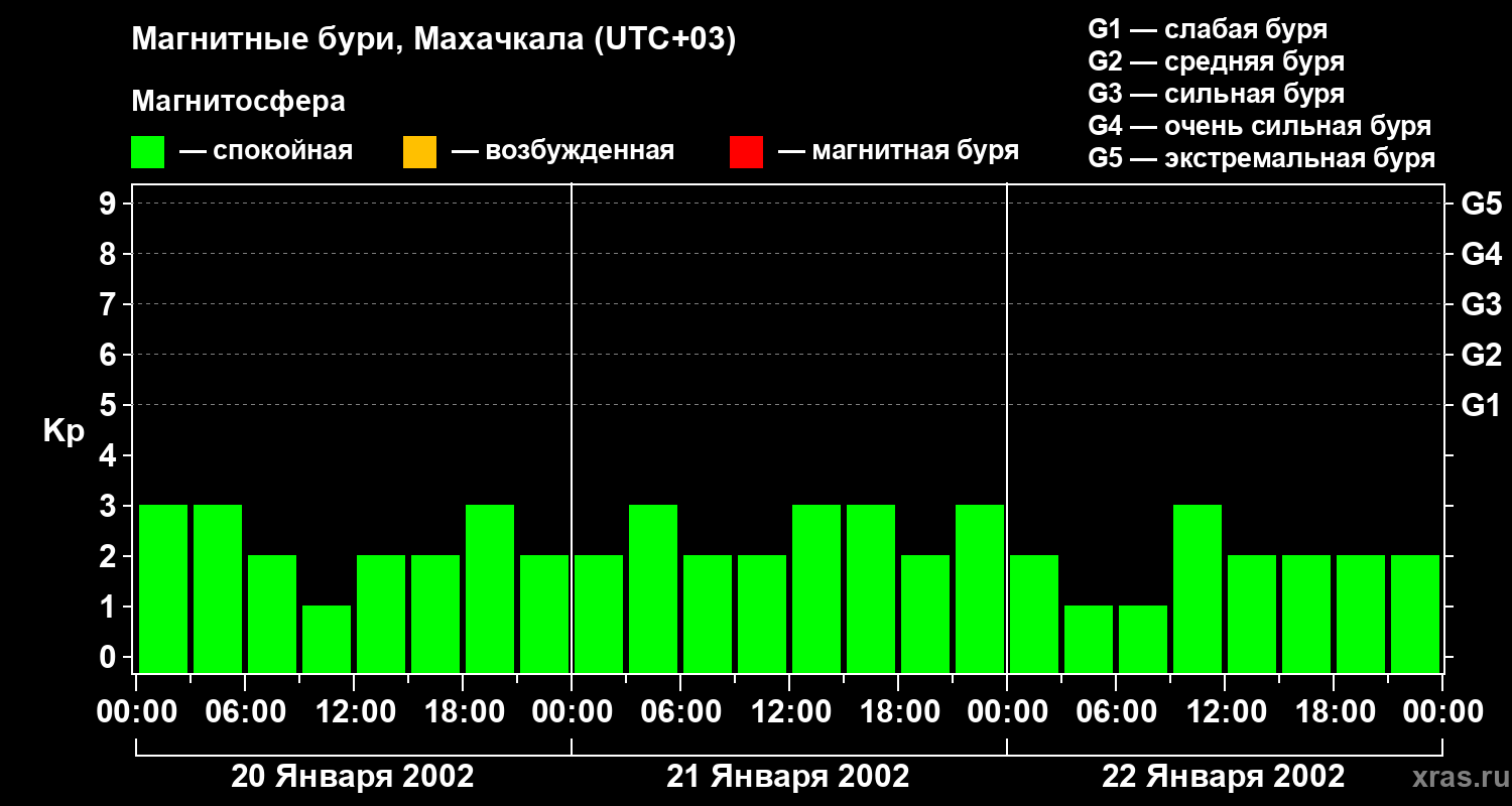 Изменения геомагнитного индекса Kp с 20 по 22 января 2002 года для средних широт