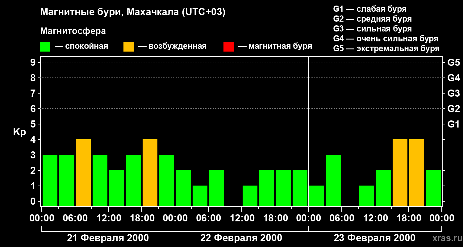 Изменения геомагнитного индекса Kp с 21 по 23 февраля 2000 года для средних широт