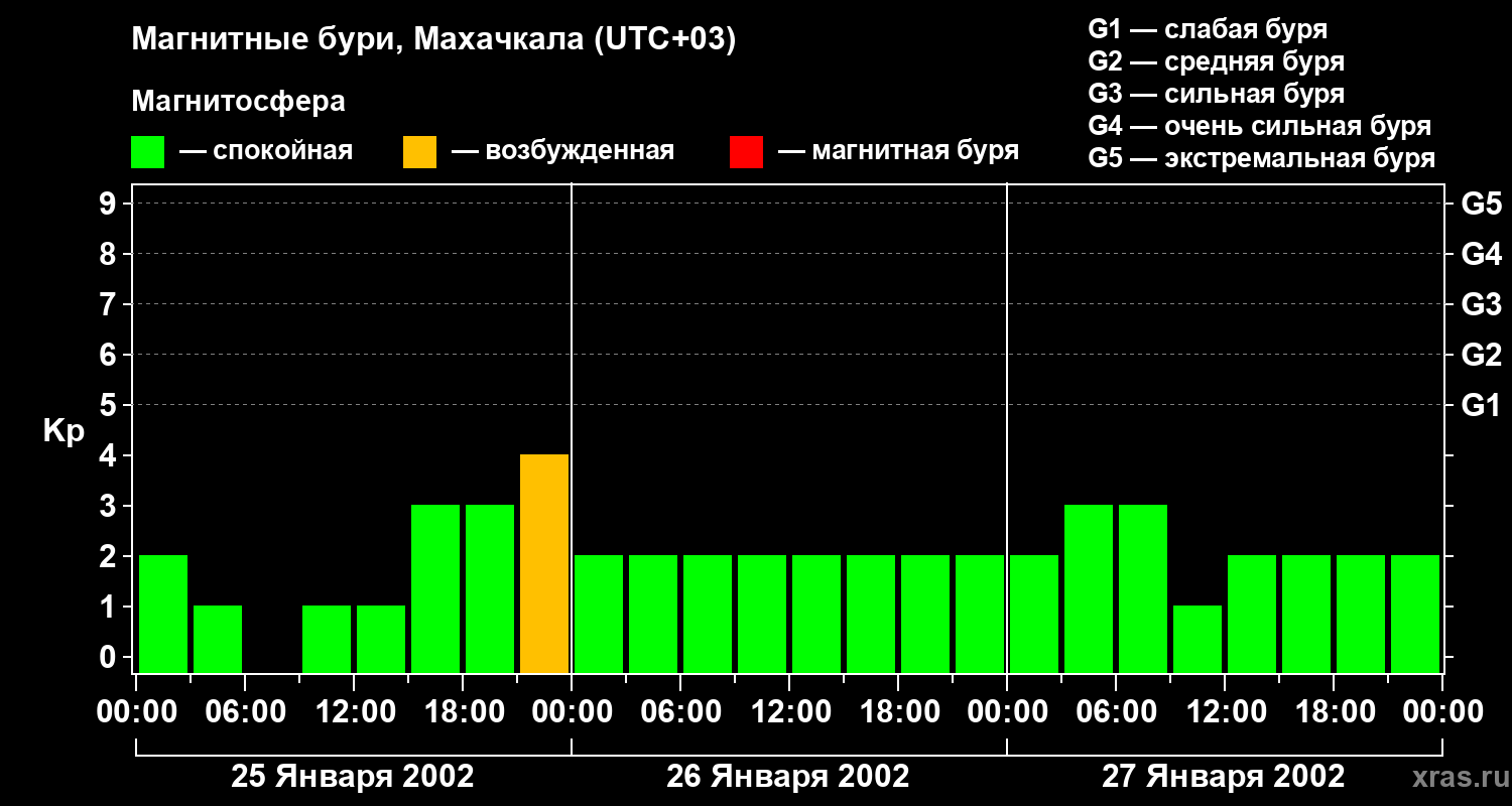 Изменения геомагнитного индекса Kp с 25 по 27 января 2002 года для средних широт