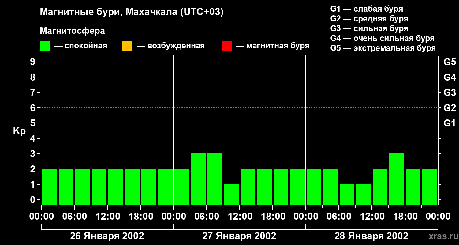Изменения геомагнитного индекса Kp с 26 по 28 января 2002 года для средних широт