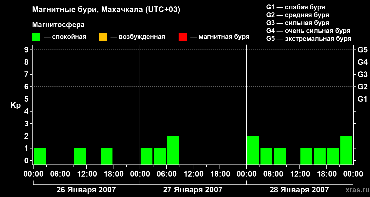 Изменения геомагнитного индекса Kp с 26 по 28 января 2007 года для средних широт
