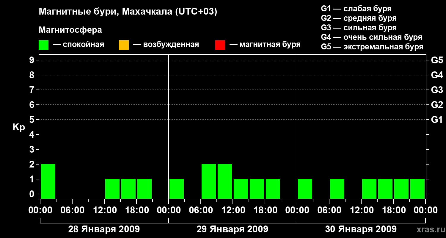 Изменения геомагнитного индекса Kp с 28 по 30 января 2009 года для средних широт