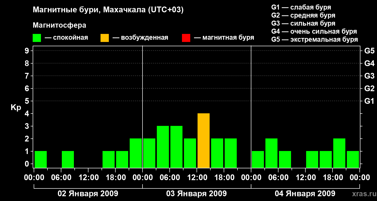 Изменения геомагнитного индекса Kp с 2 по 4 января 2009 года для средних широт