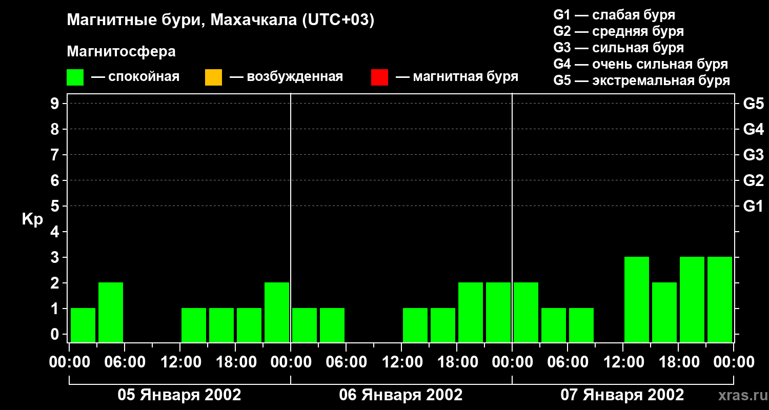 Изменения геомагнитного индекса Kp с 5 по 7 января 2002 года для средних широт