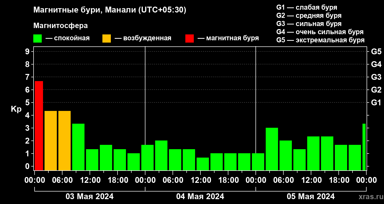 Изменения геомагнитного индекса Kp с 3 по 5 мая 2024 года для средних широт