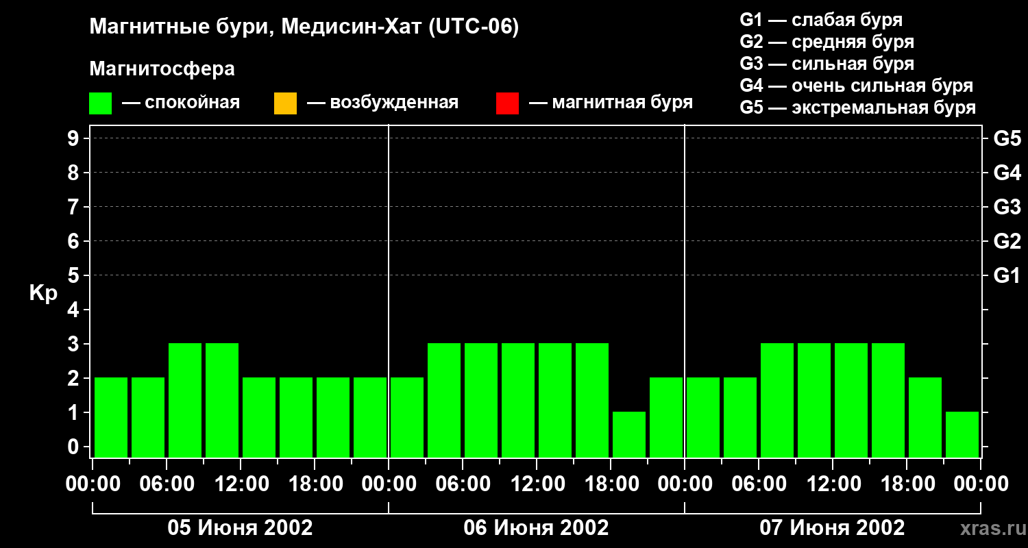 Изменения геомагнитного индекса Kp с 5 по 7 июня 2002 года для средних широт