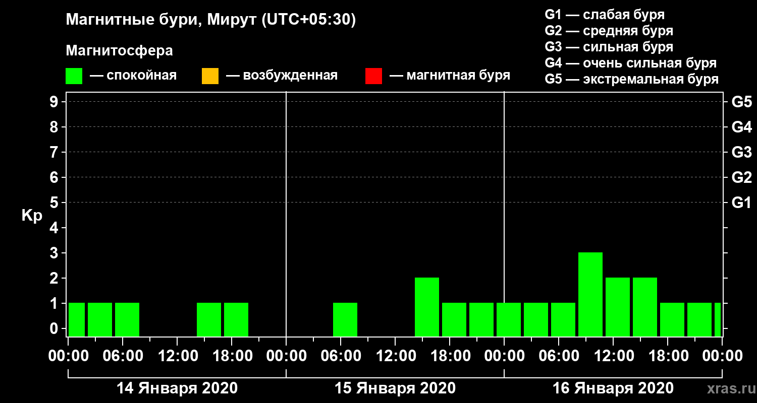 Изменения геомагнитного индекса Kp с 14 по 16 января 2020 года для средних широт