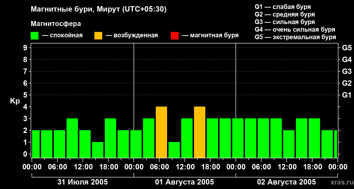 Изменения геомагнитного индекса Kp с 31 июля по 2 августа 2005 года для средних широт