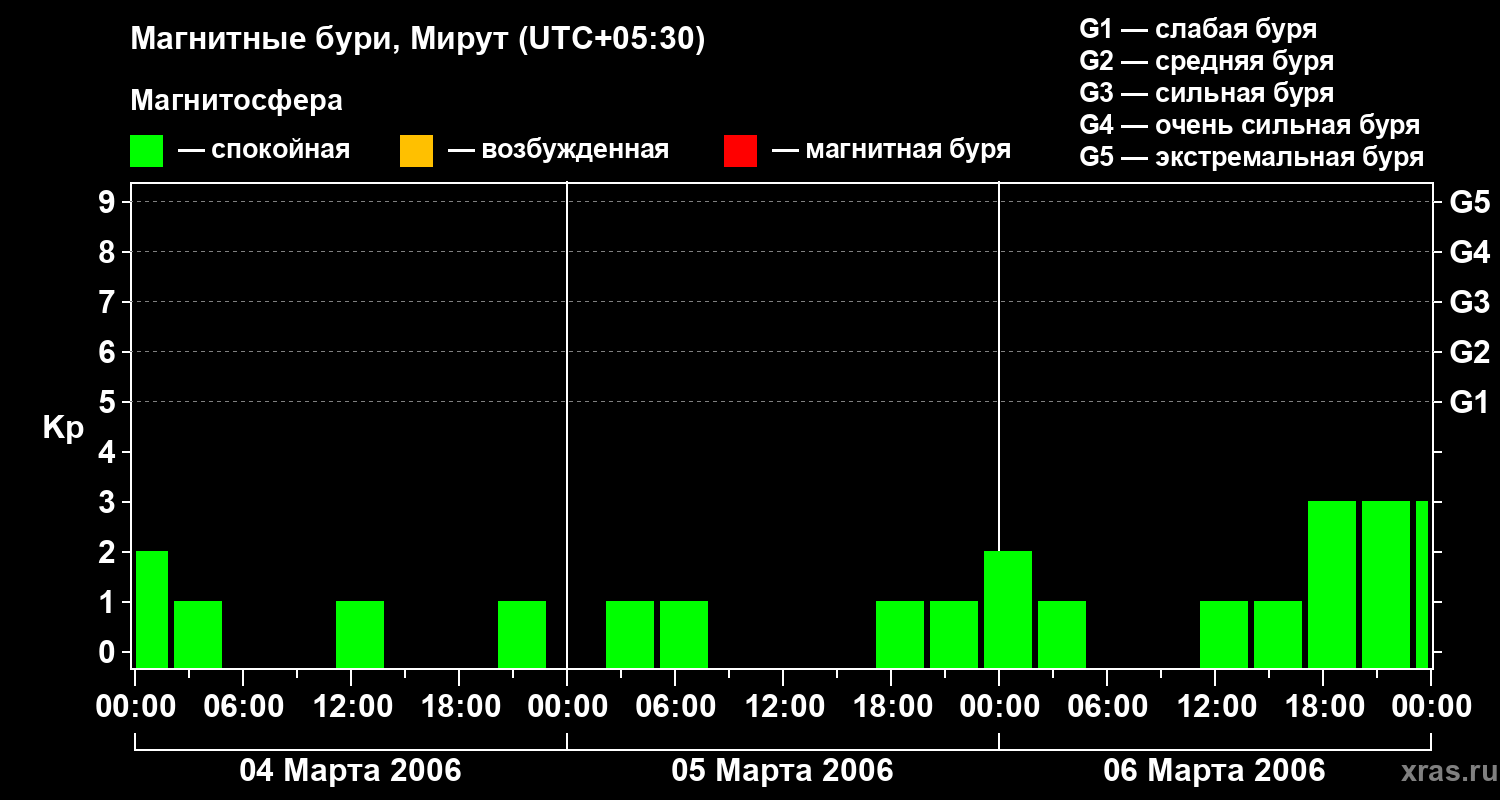 Изменения геомагнитного индекса Kp с 4 по 6 марта 2006 года для средних широт