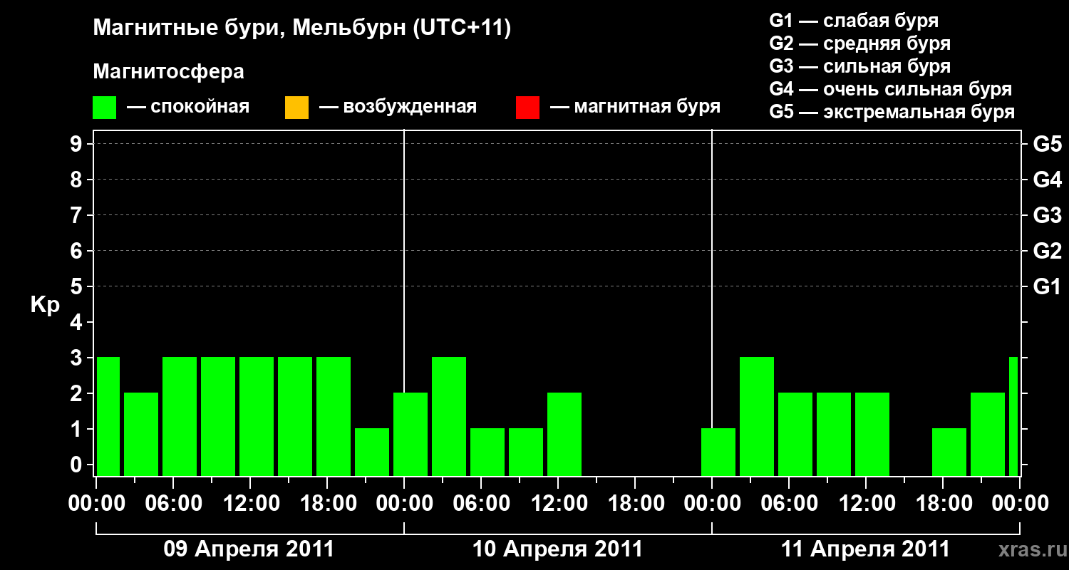 Изменения геомагнитного индекса Kp с 9 по 11 апреля 2011 года для средних широт