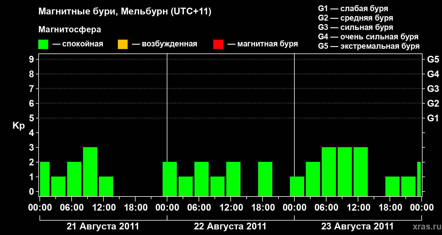 Изменения геомагнитного индекса Kp с 21 по 23 августа 2011 года для средних широт