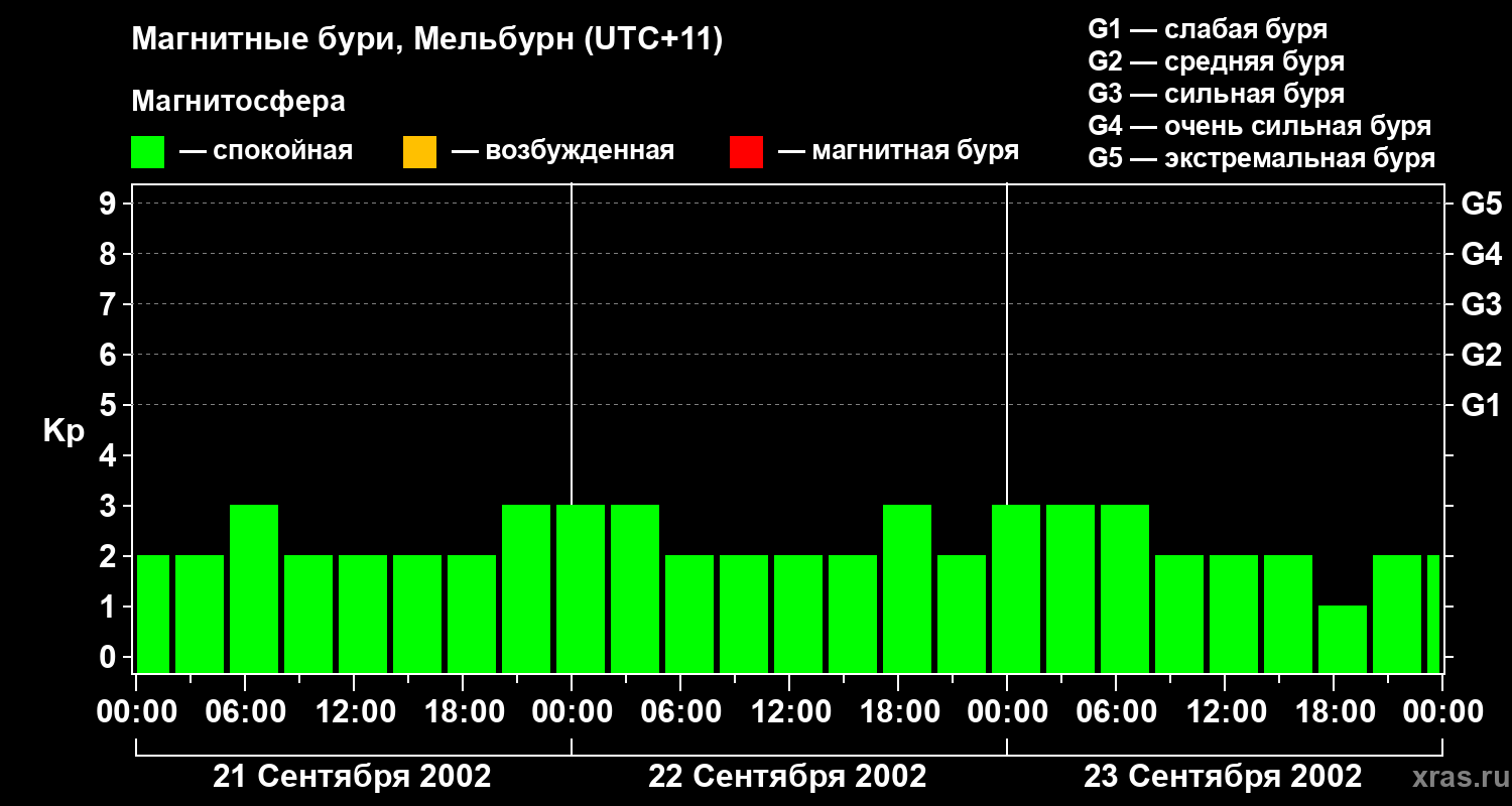 Изменения геомагнитного индекса Kp с 21 по 23 сентября 2002 года для средних широт