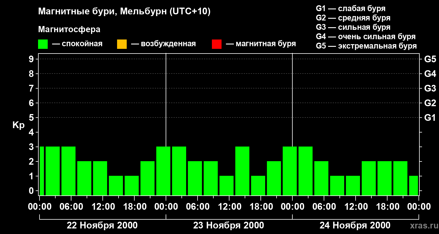 Изменения геомагнитного индекса Kp с 22 по 24 ноября 2000 года для средних широт