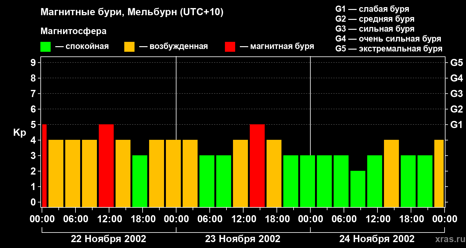 Изменения геомагнитного индекса Kp с 22 по 24 ноября 2002 года для средних широт