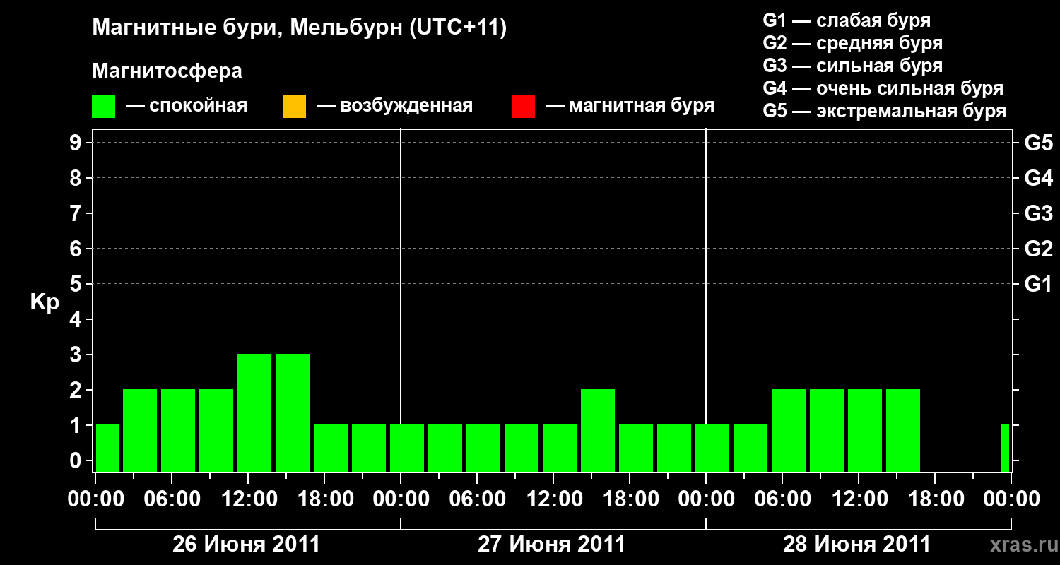 Изменения геомагнитного индекса Kp с 26 по 28 июня 2011 года для средних широт