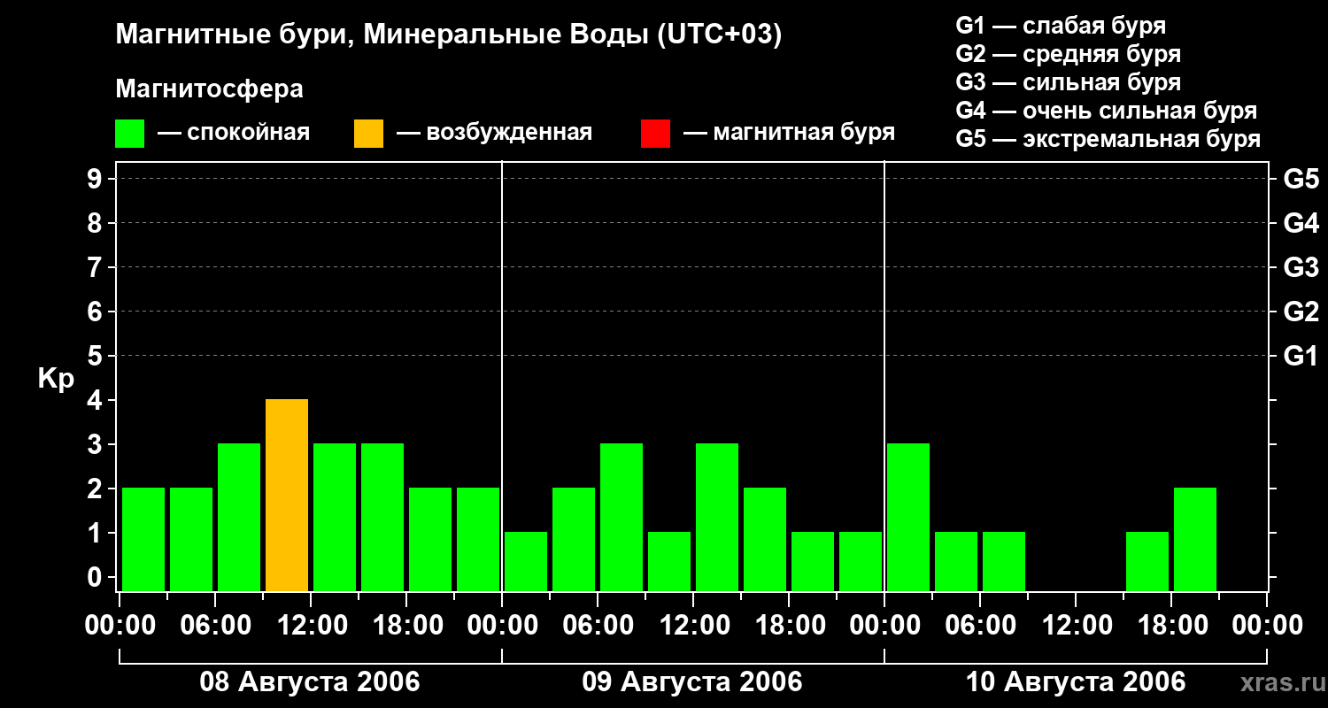 Изменения геомагнитного индекса Kp с 8 по 10 августа 2006 года для средних широт