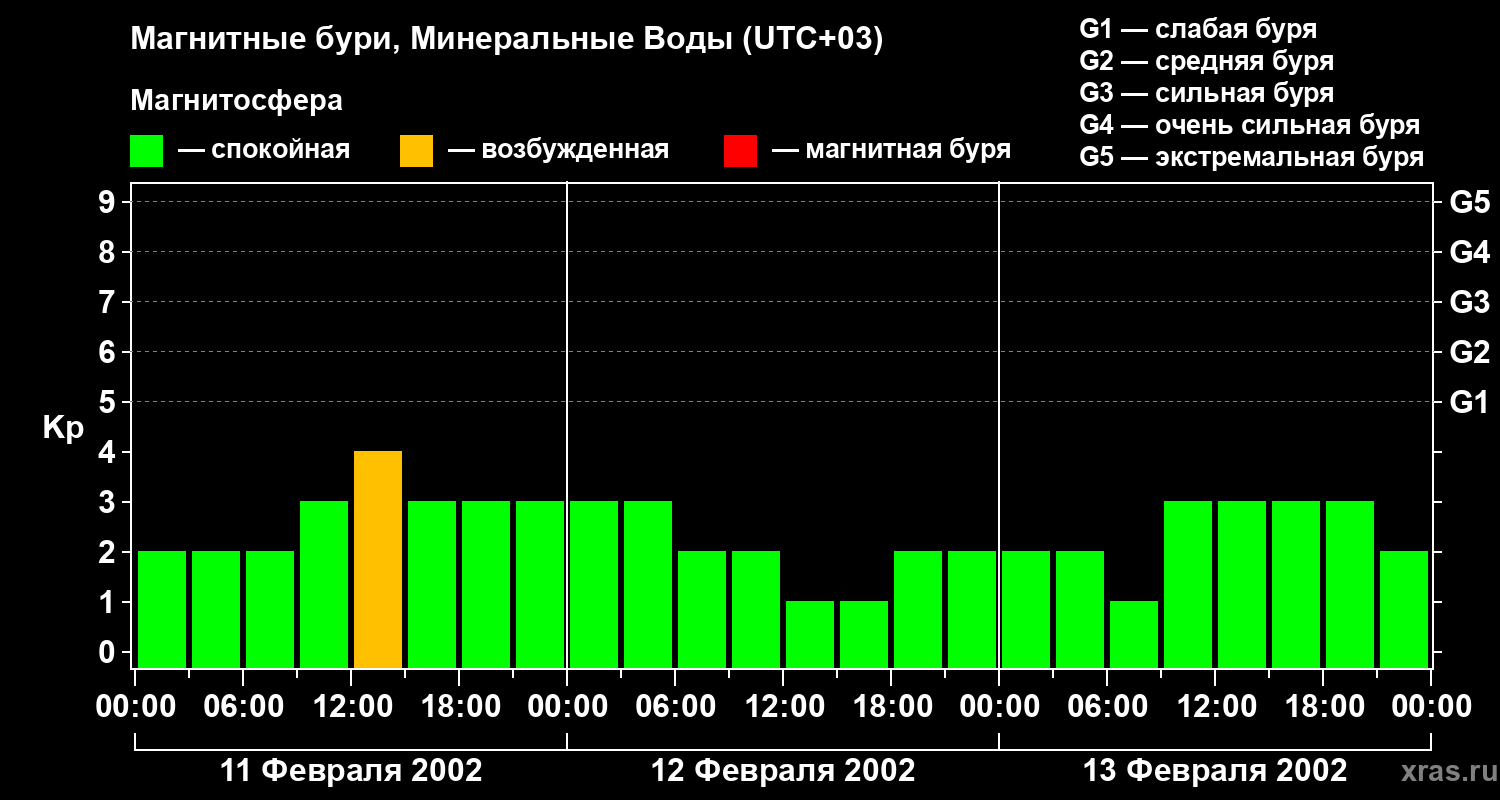 Изменения геомагнитного индекса Kp с 11 по 13 февраля 2002 года для средних широт