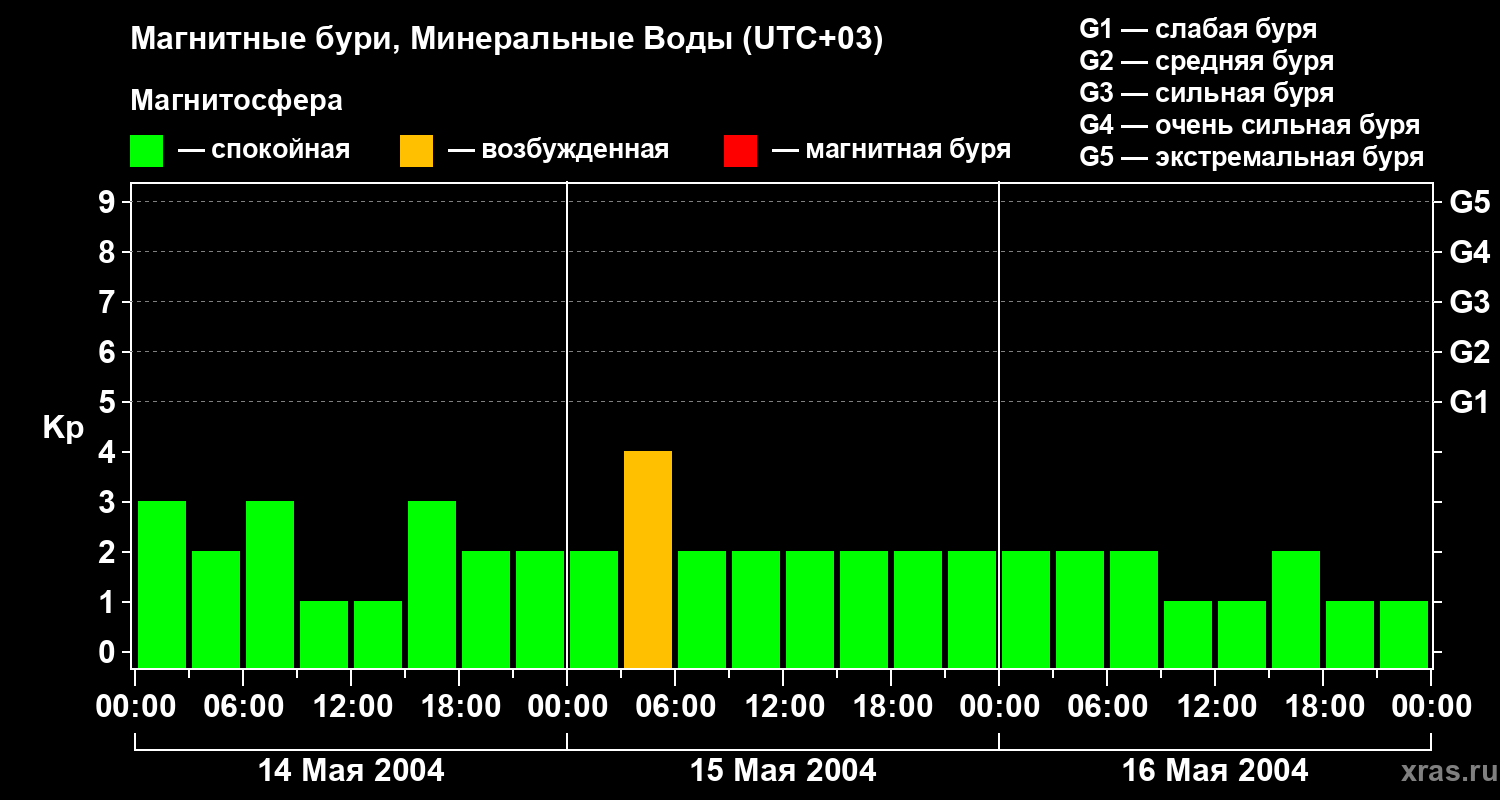 Изменения геомагнитного индекса Kp с 14 по 16 мая 2004 года для средних широт