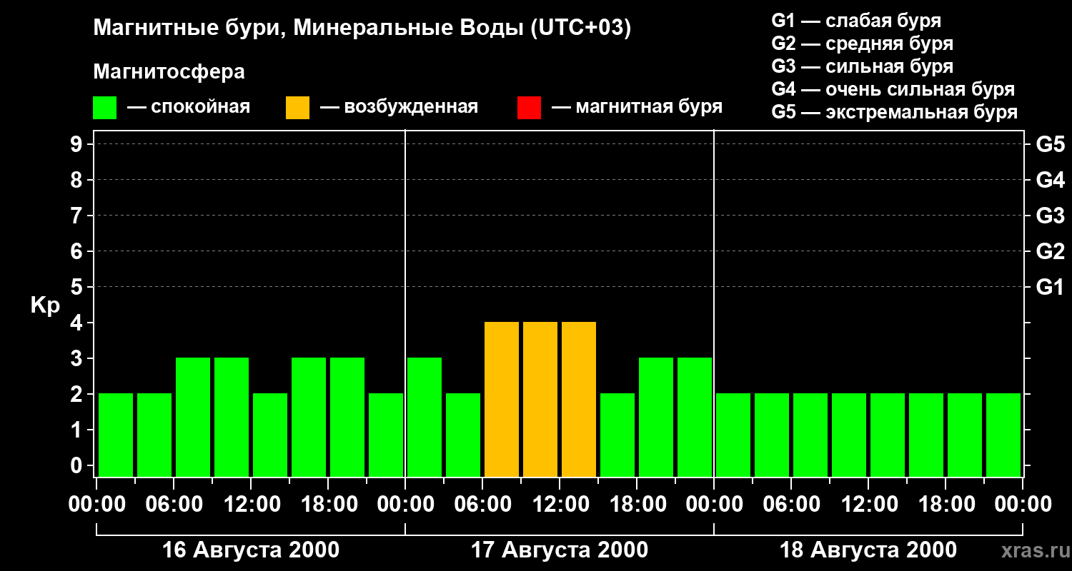 Изменения геомагнитного индекса Kp с 16 по 18 августа 2000 года для средних широт