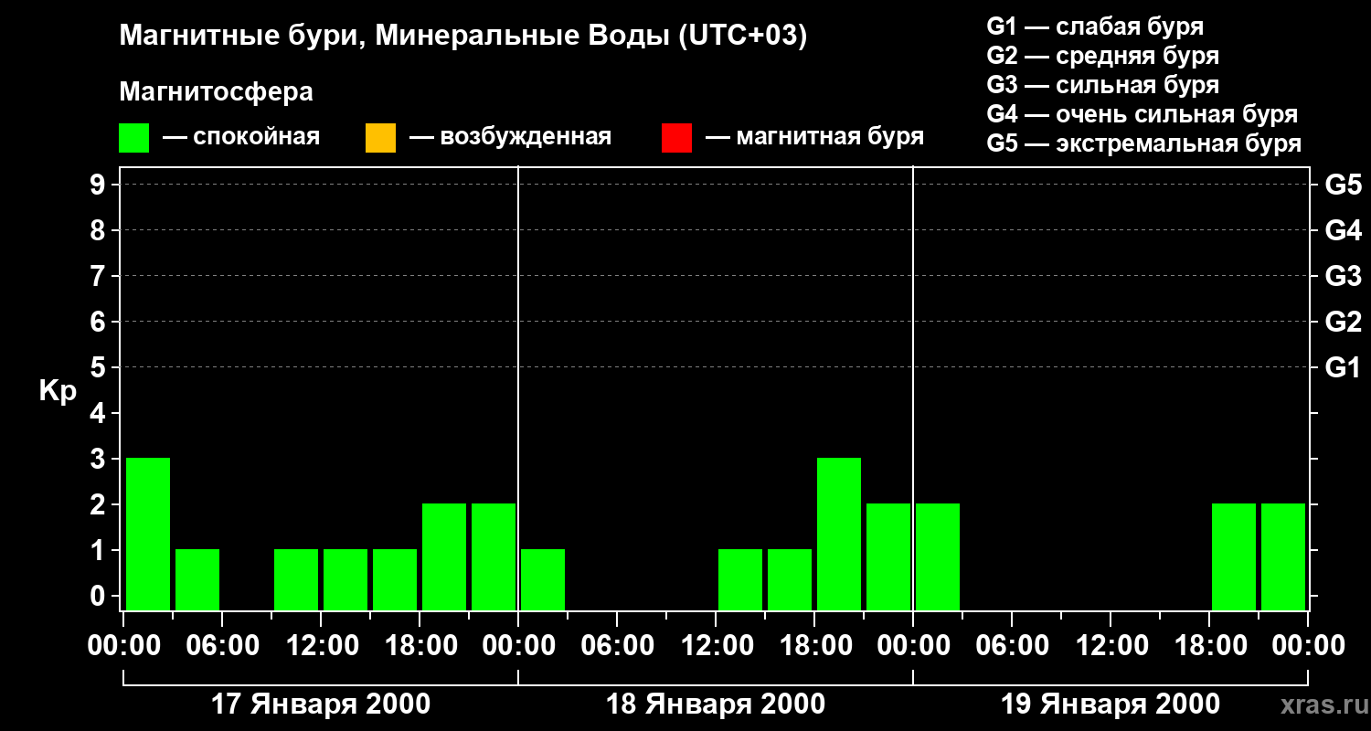 Изменения геомагнитного индекса Kp с 17 по 19 января 2000 года для средних широт
