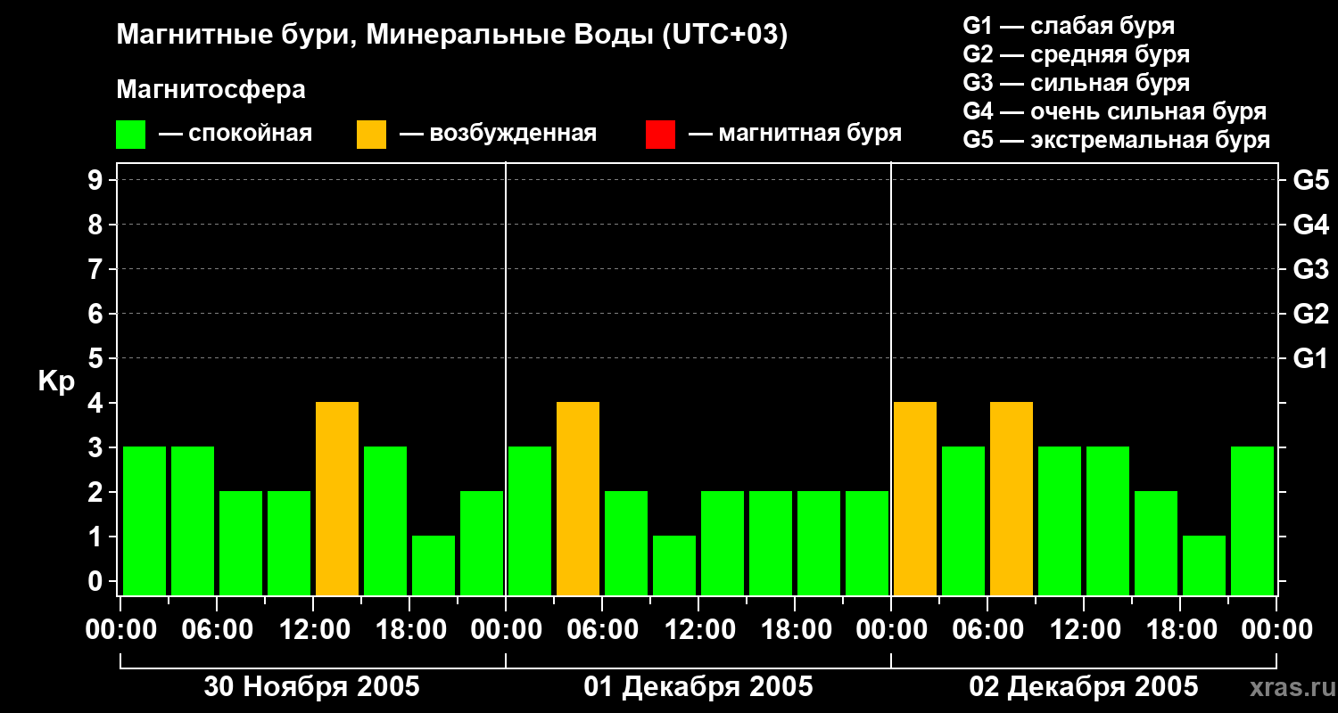 Изменения геомагнитного индекса Kp с 30 ноября по 2 декабря 2005 года для средних широт