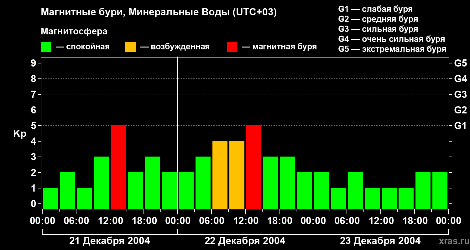 Изменения геомагнитного индекса Kp с 21 по 23 декабря 2004 года для средних широт
