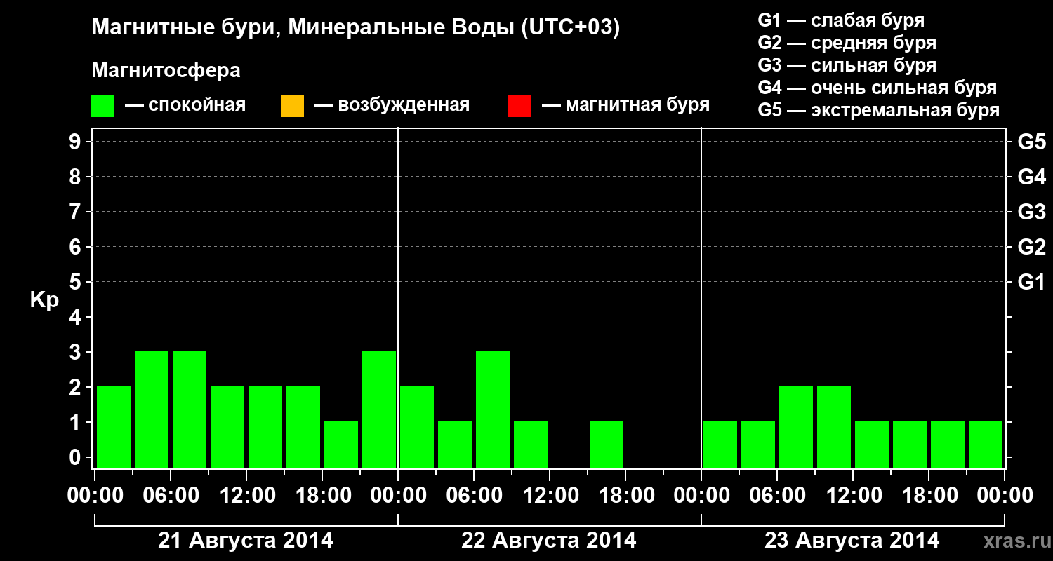 Изменения геомагнитного индекса Kp с 21 по 23 августа 2014 года для средних широт