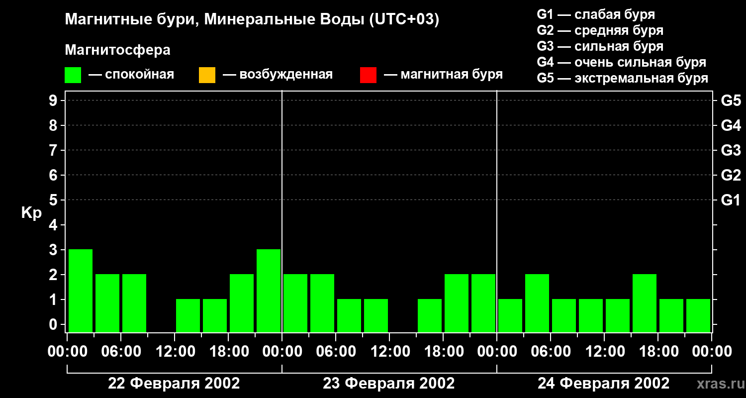 Изменения геомагнитного индекса Kp с 22 по 24 февраля 2002 года для средних широт
