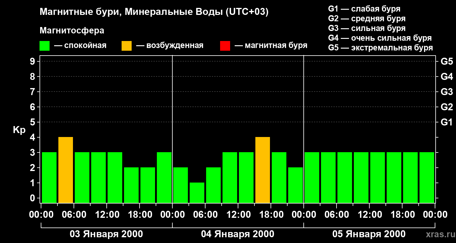 Изменения геомагнитного индекса Kp с 3 по 5 января 2000 года для средних широт