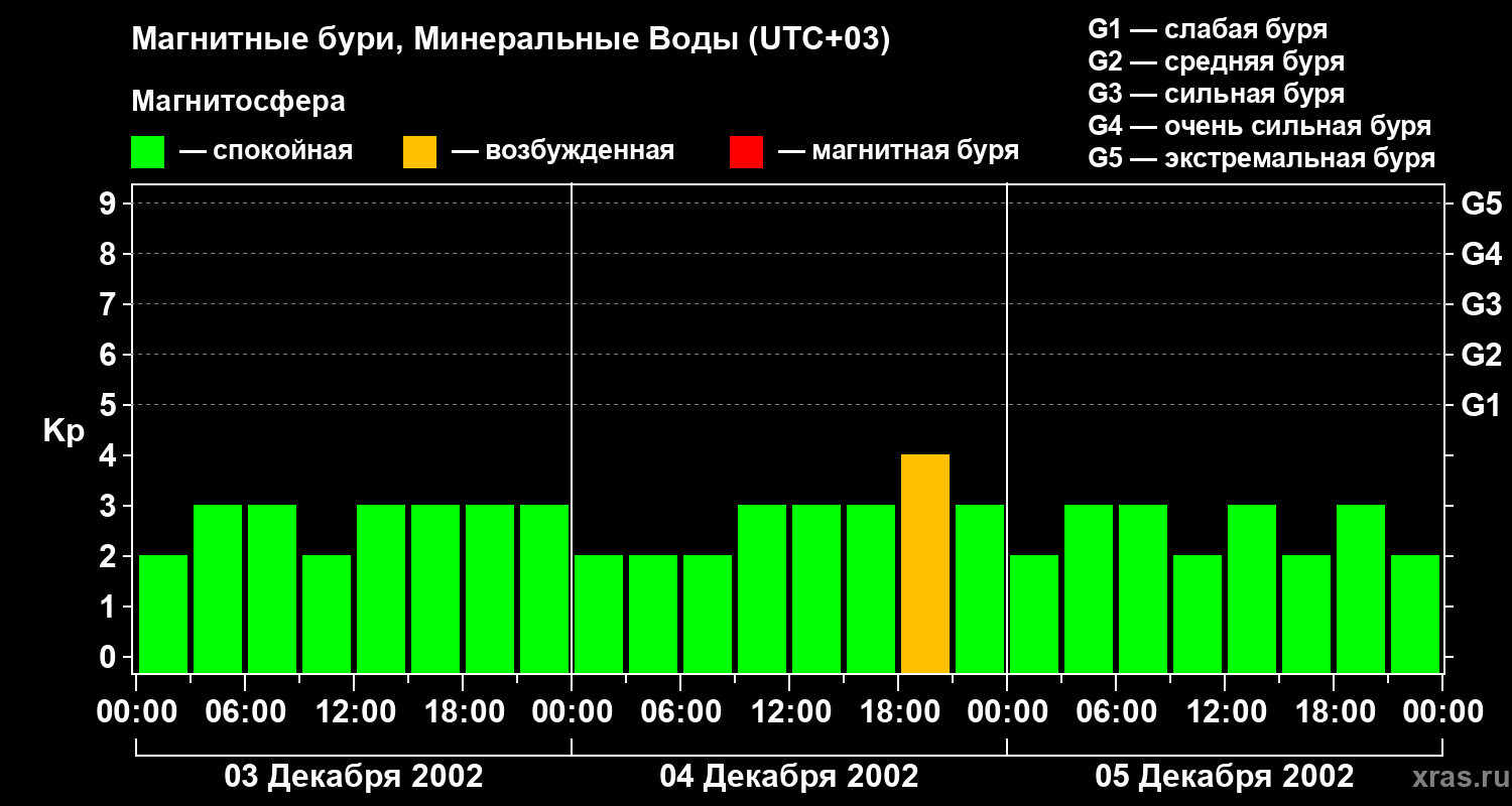 Изменения геомагнитного индекса Kp с 3 по 5 декабря 2002 года для средних широт