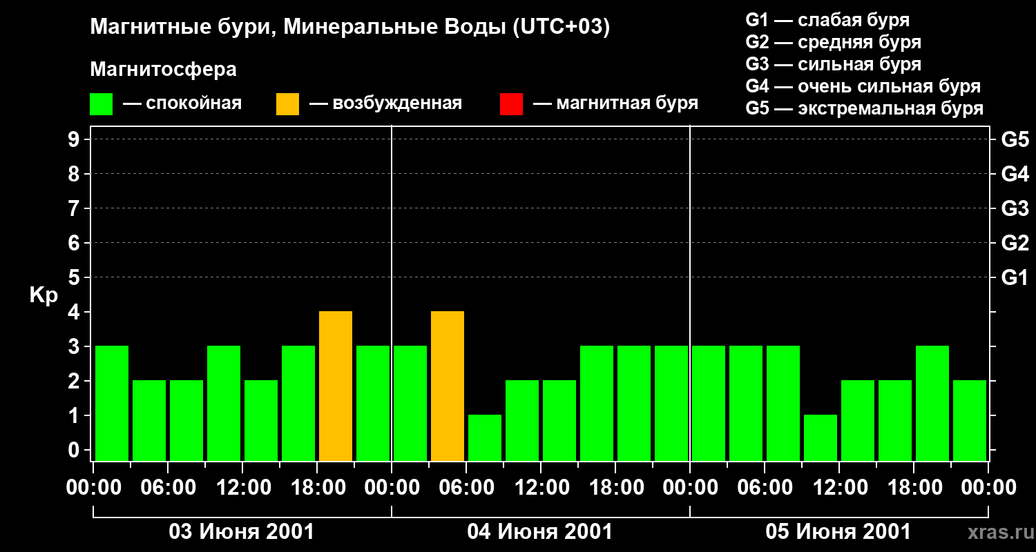 Изменения геомагнитного индекса Kp с 3 по 5 июня 2001 года для средних широт