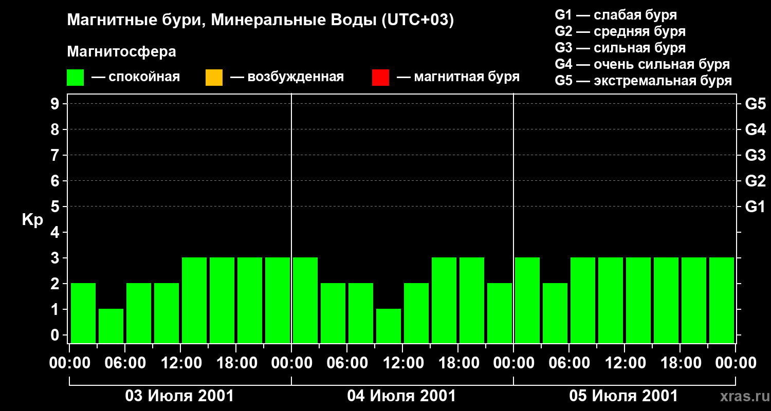 Изменения геомагнитного индекса Kp с 3 по 5 июля 2001 года для средних широт
